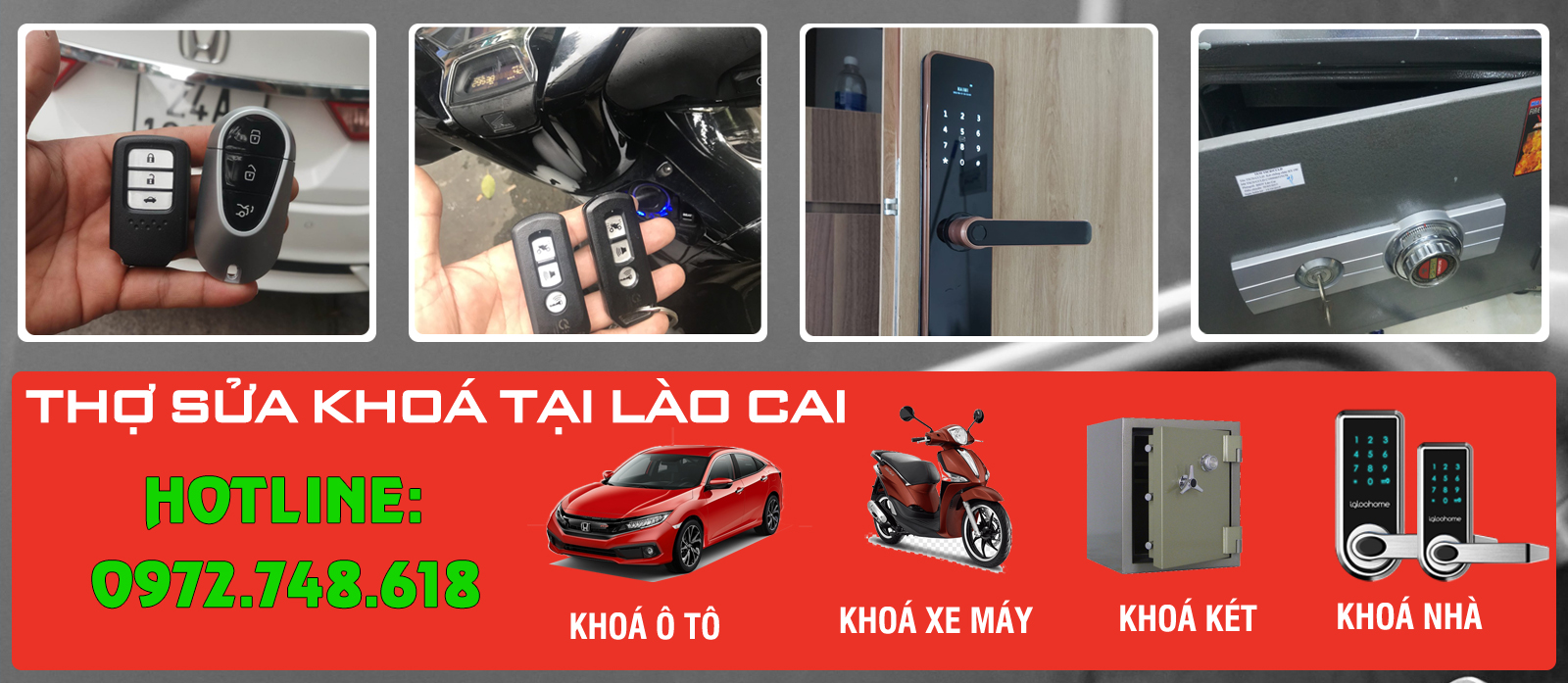 Sửa Khoá Lào Cai với hơn 10 năm kinh nghiệm trong ngành trong lĩnh vực sửa chữa và thay thế các loại khóa. Chúng tôi chuyên sửa chữa, làm mới, lắp đặt các loại khóa: chìa khóa ô tô, xe máy, khóa cửa nhà, cửa cổng, két sắt, khóa vân tay, điện tử…tận nơi Lào Cai. Liên hệ ngay.